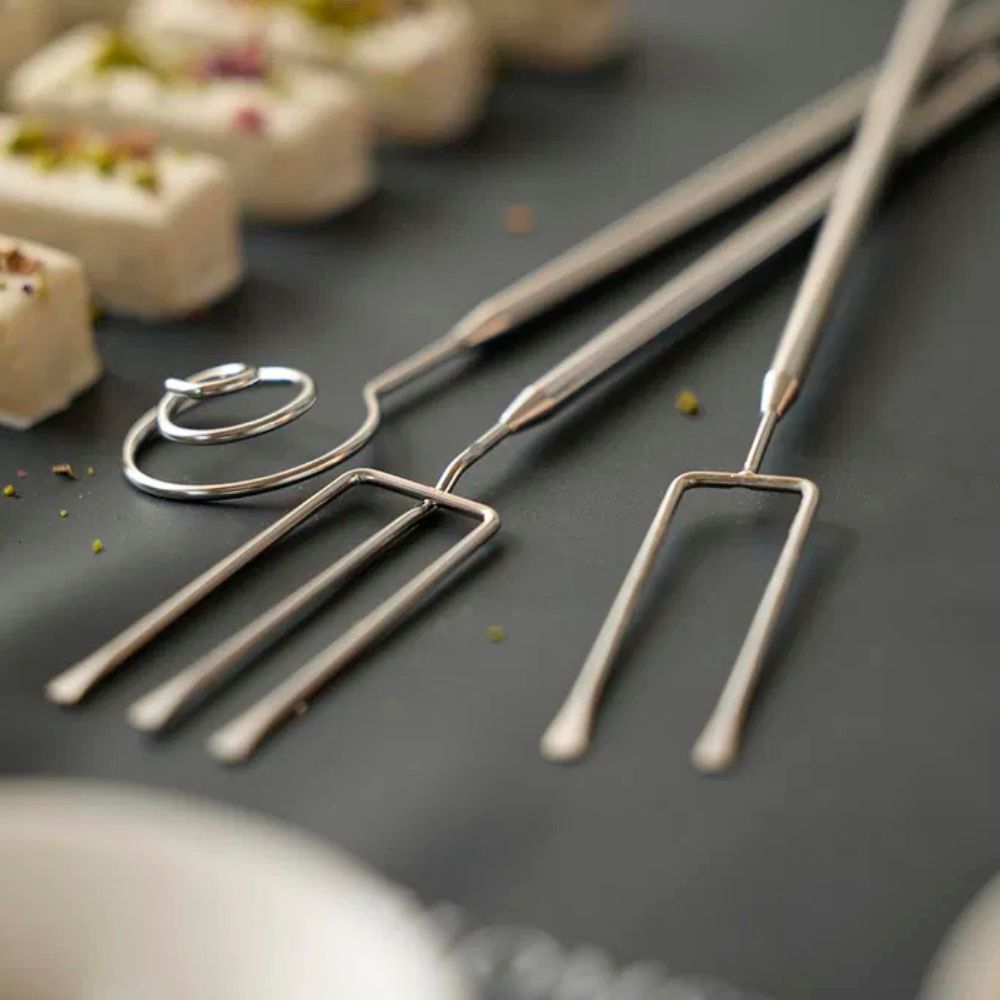 Skab professionelle chokoladeovertræk og smukke konfektkreationer med dette elegante chokoladegaffelsæt fra Blomsterbergs. Sættet består af tre specialgafler i rustfrit stål: én med to tænder, én med tre tænder og én spiralgaffel. Hver gaffel er designet til at give dig fuld kontrol, når du dypper frugt, småkager, trøfler eller konfekt i smeltet chokolade.
