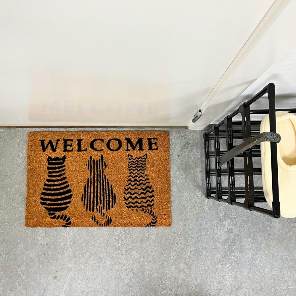 Pæn og slidstærk dørmåtte fremstillet i kokos med sort gummibagside. Sød sort tegning af katte på oversiden.