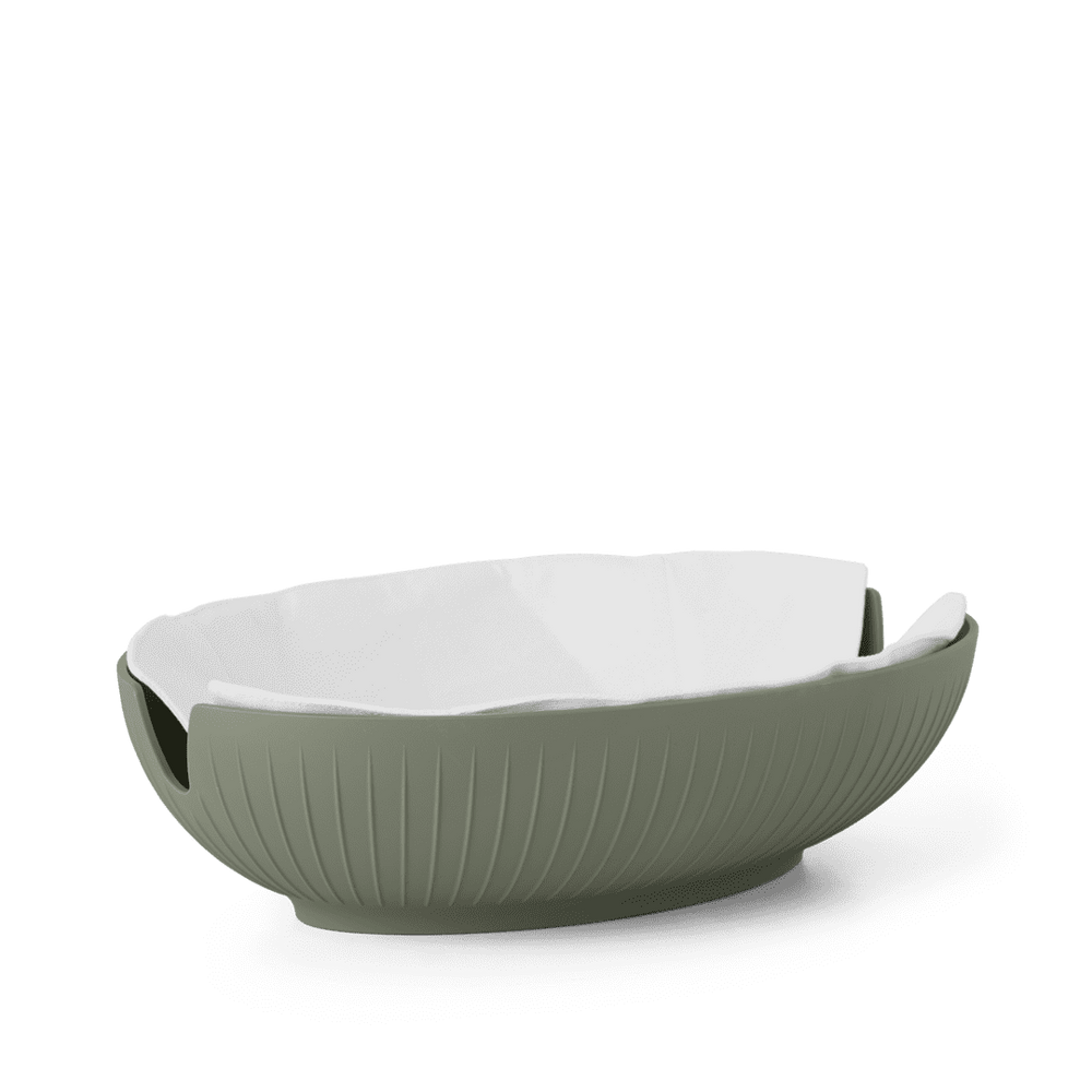 Den grønne Hammershøi-brødkurv kombinerer funktion og stil. Den biobaserede plast giver en mat finish, der matcher resten af Hammershøi-serien, mens den praktiske slids holder brødkniven lige ved hånden. Den medfølgende stofserviet fremhæver brødet smukt, og de ikoniske riller fuldender det klassiske design.