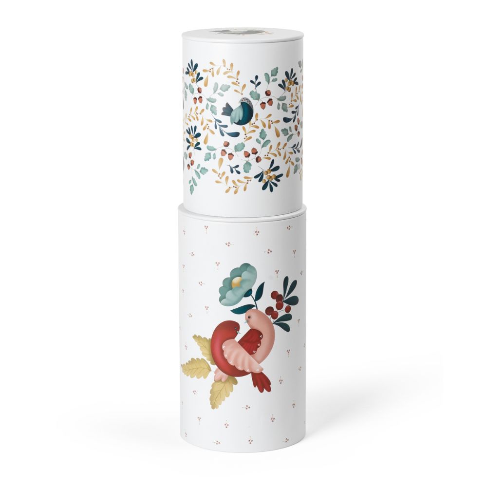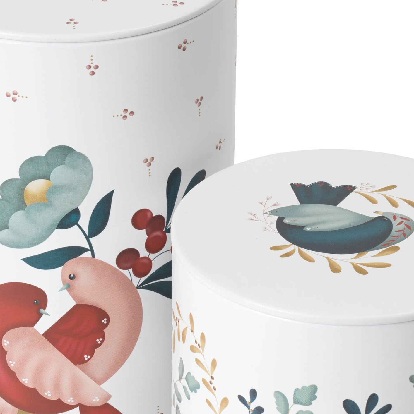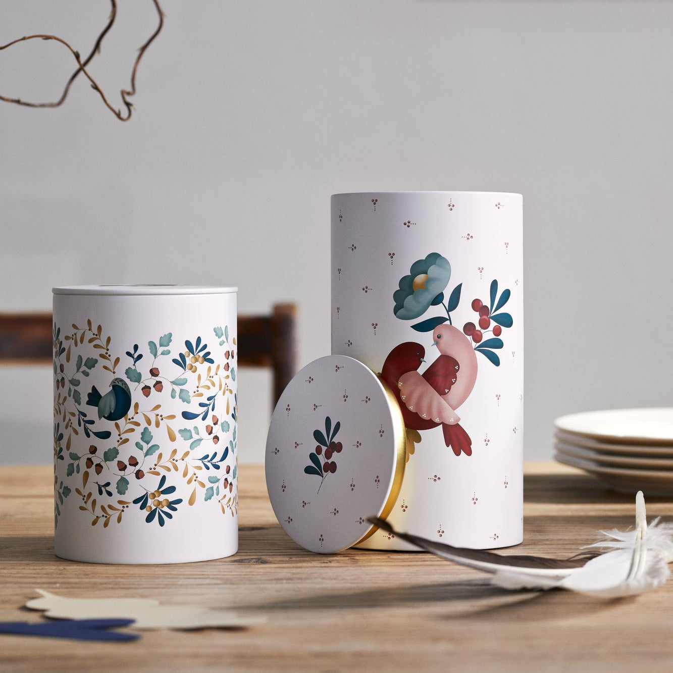 De to dåser i dette sæt – én med diameter på 10 cm og én på 11 cm – har et elegant, hvidt design dekoreret med varme, grafiske motiver af blade, bær, fugle og kristtjørn. De passer perfekt til opbevaring af hjemmebag, småkager, te, kaffe eller julegodter og bringer et strejf af moderne nostalgi til både hverdag og højtider.