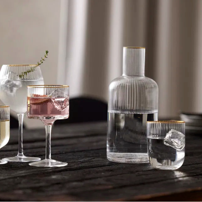 Lyngby Palermo karaffel Gold er en stilfuld og funktionel karaffel, perfekt til servering af vand, juice, vin eller cocktails. Karaffelens elegante guldkant giver et eksklusivt udtryk, og den rummelige kapacitet på 1,5 liter gør den ideel til både hverdag og festlige lejligheder. Det mundblæste glas sikrer høj kvalitet og et flot finish.