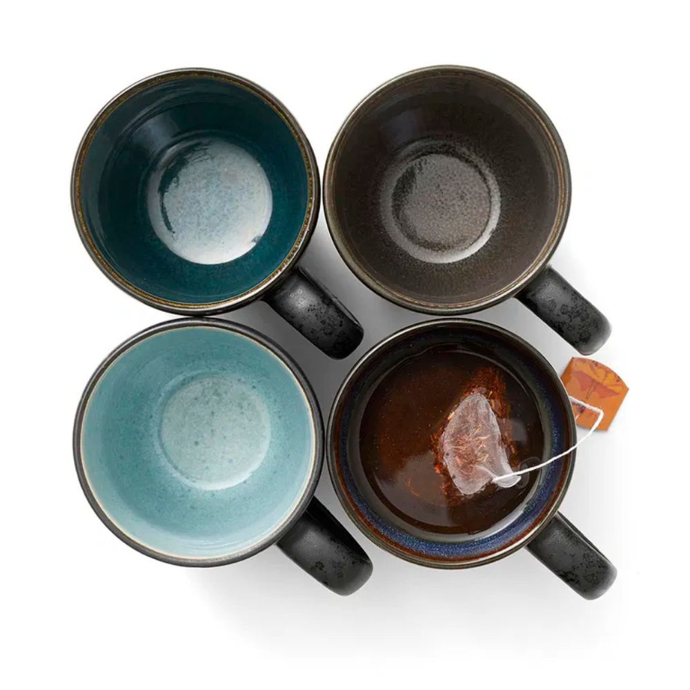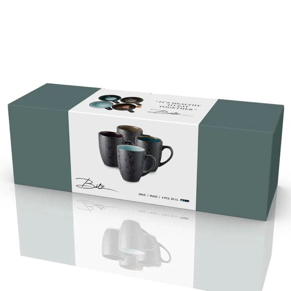 Tilføj både karakter og varme til borddækningen med dette elegante krussæt fra Bitz. Sættet består af fire krus i sort stentøj med mat yderside og hver sin unikke, reaktive glasur indvendigt i farverne grå, grøn, lysblå og mørkeblå. Hvert krus rummer 30 cl – perfekt til kaffe, te eller kakao.