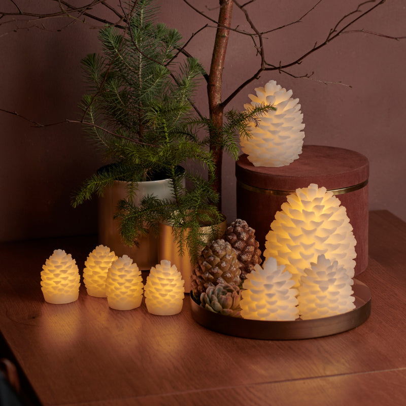 Sirius – Clara voks koglesæt 2 stk. er et dekorativt sæt af to elegante grankogler, der bringer naturens rolige skønhed ind i hjemmet. De realistiske voksfigurer er oplyst indefra af et varmt LED-lys, som skaber en blød og hyggelig glød. Clara koglerne passer perfekt i vindueskarme, på borde eller som del af en juledekoration, og de kan nemt kombineres med andre elementer fra Sirius’ kollektion for en stemningsfuld vinterindretning.
