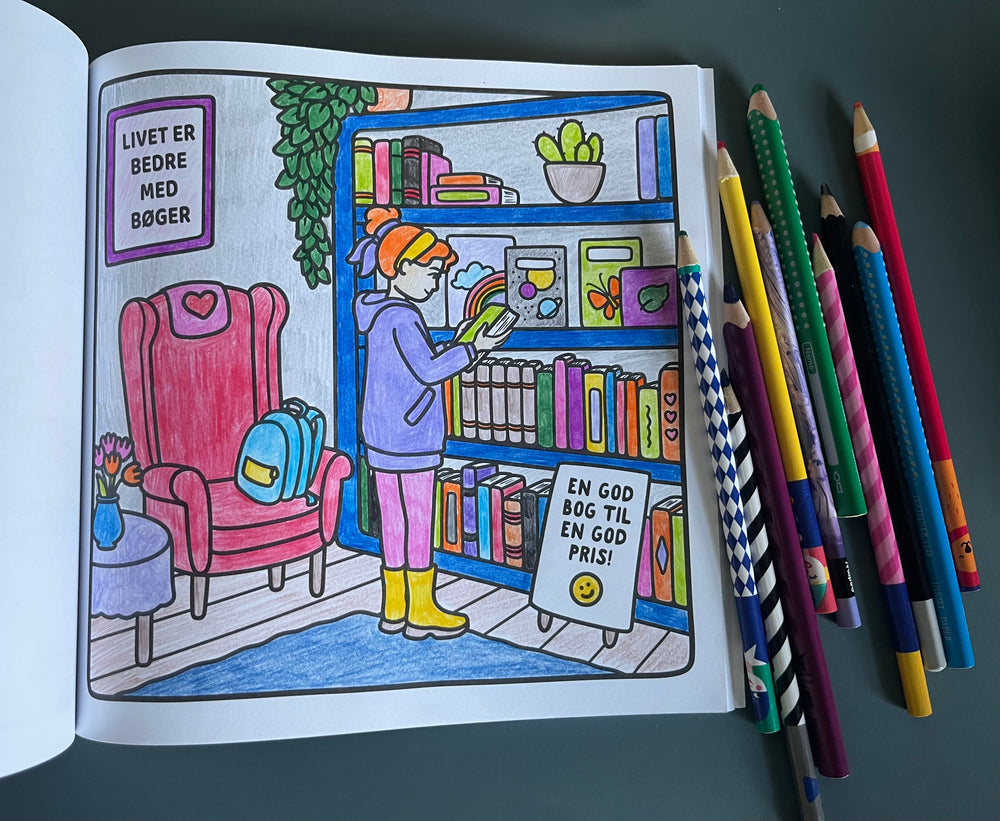 Du kan både bruge farveblyanter og tusser til at farvelægge de hyggelige motiver i bogen. Prøv dig frem på testsiden og vælg de farver og nuancer, du bedst kan lide.