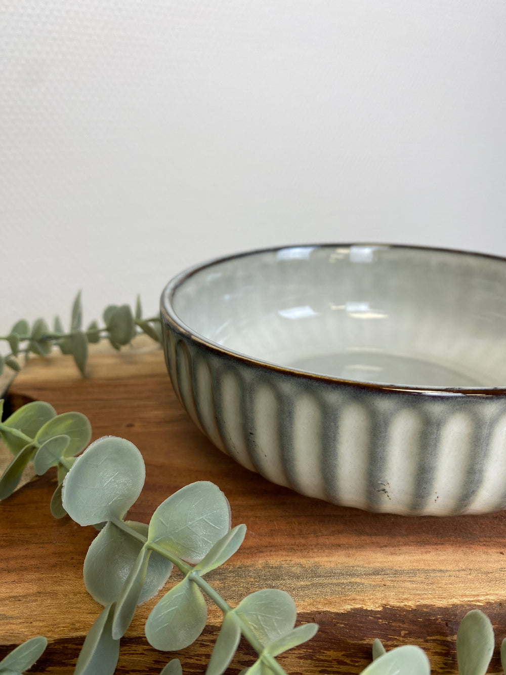 Elegant og funktionel skål i en smuk farve med dekorative lodrette riller. Skålen er fremstillet i keramik og har en glaseret overflade, som giver et rustikt og håndlavet udtryk.