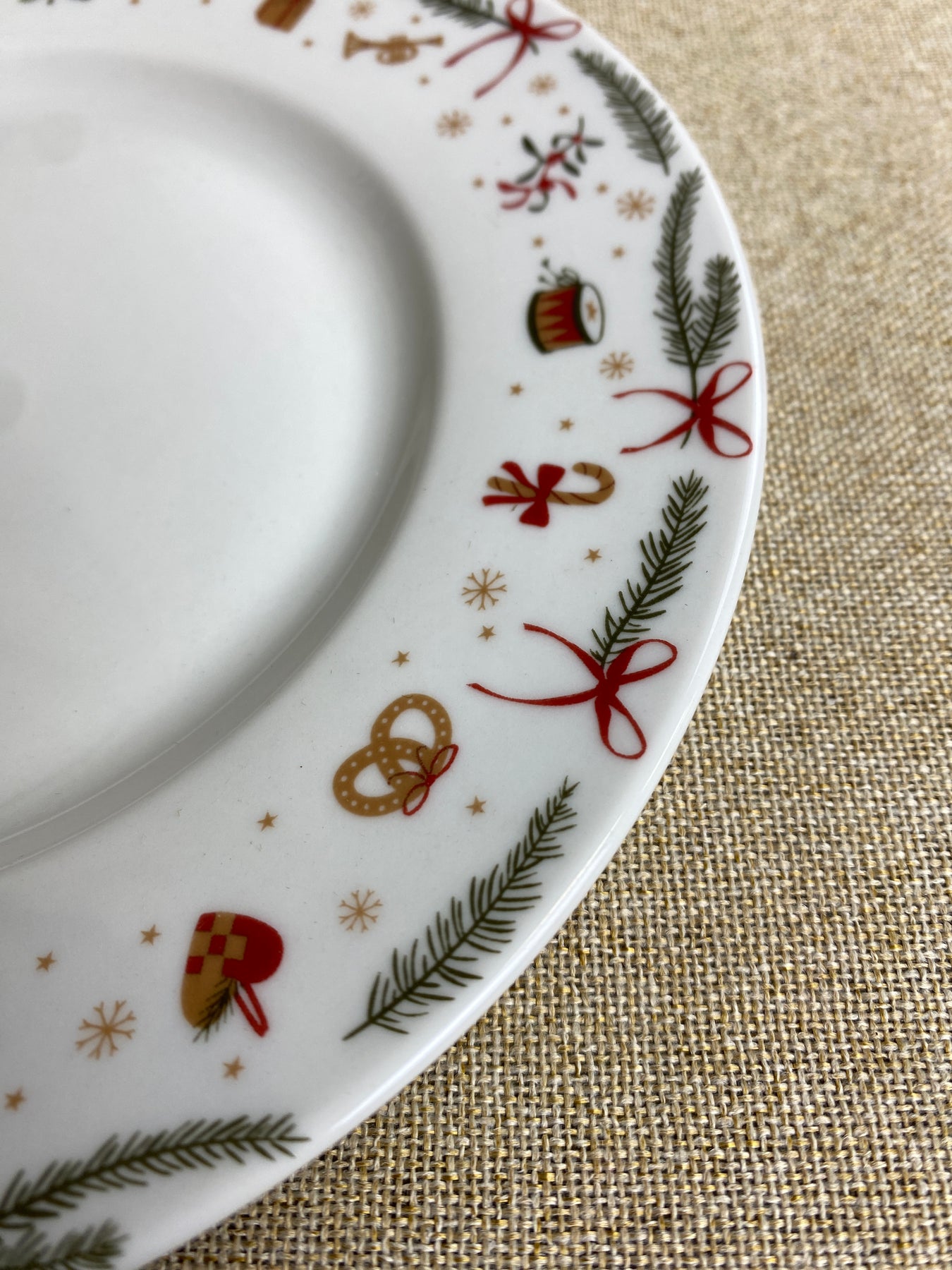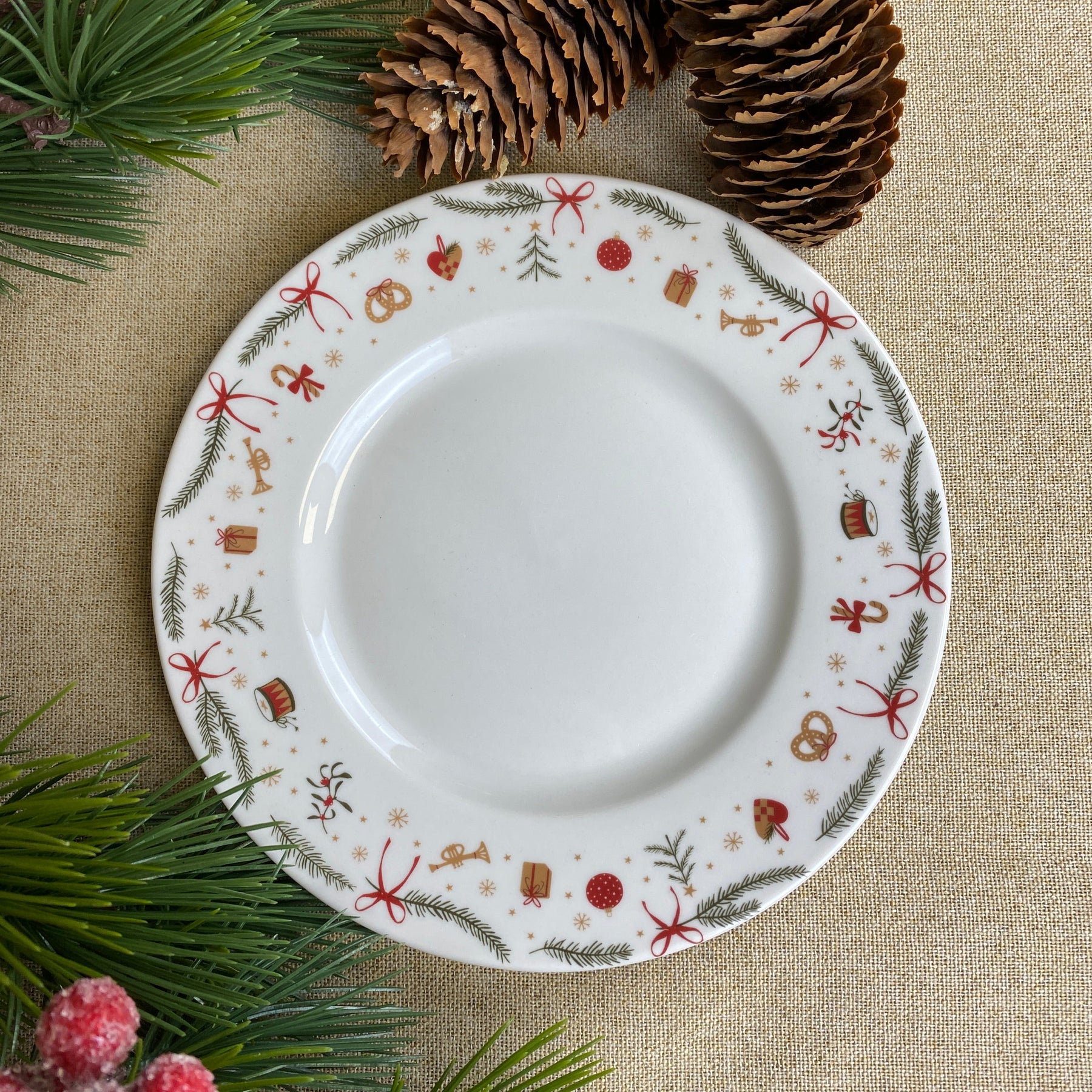 Dæk op til jul med denne elegante tallerken i hvidt porcelæn, dekoreret med fine julemotiver af gran, røde sløjfer, juletræer og julehjerter. Tallerkenen har en diameter på 19 cm og er ideel til både festlige middage og hyggelige sammenkomster i juletiden. Den skaber en varm og stemningsfuld atmosfære og passer perfekt som en del af juleborddækningen.