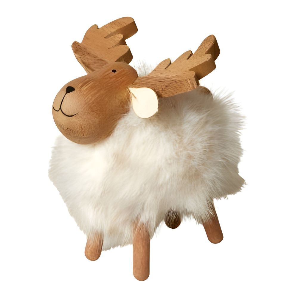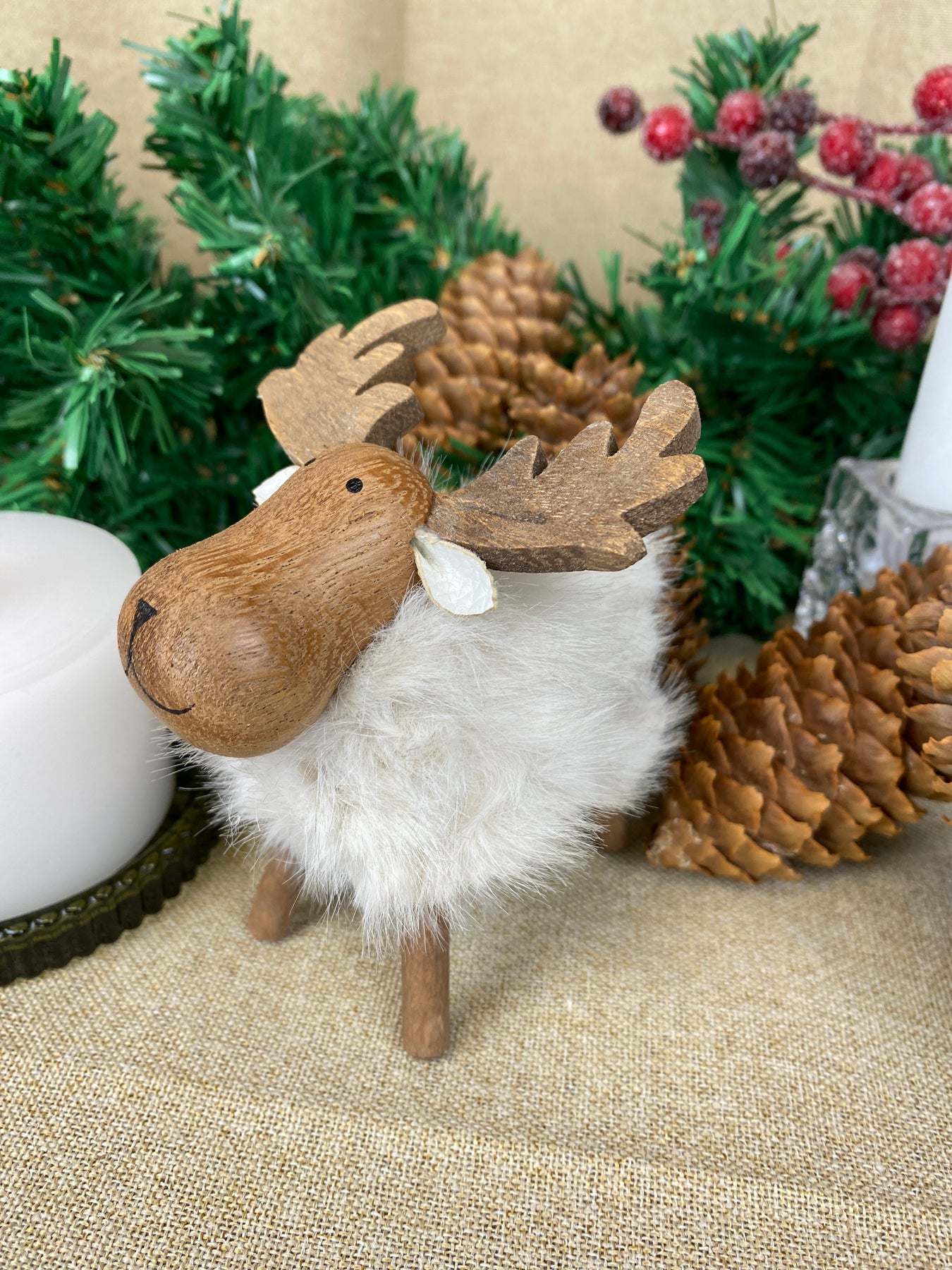 Sød elg med blød pels i hvid farve – perfekt som en hyggelig og dekorativ detalje i din indretning. Figuren kombinerer det naturlige udtryk fra træ med den bløde og lune tekstur fra polyesterpelsen, hvilket giver et varmt og charmerende udtryk.