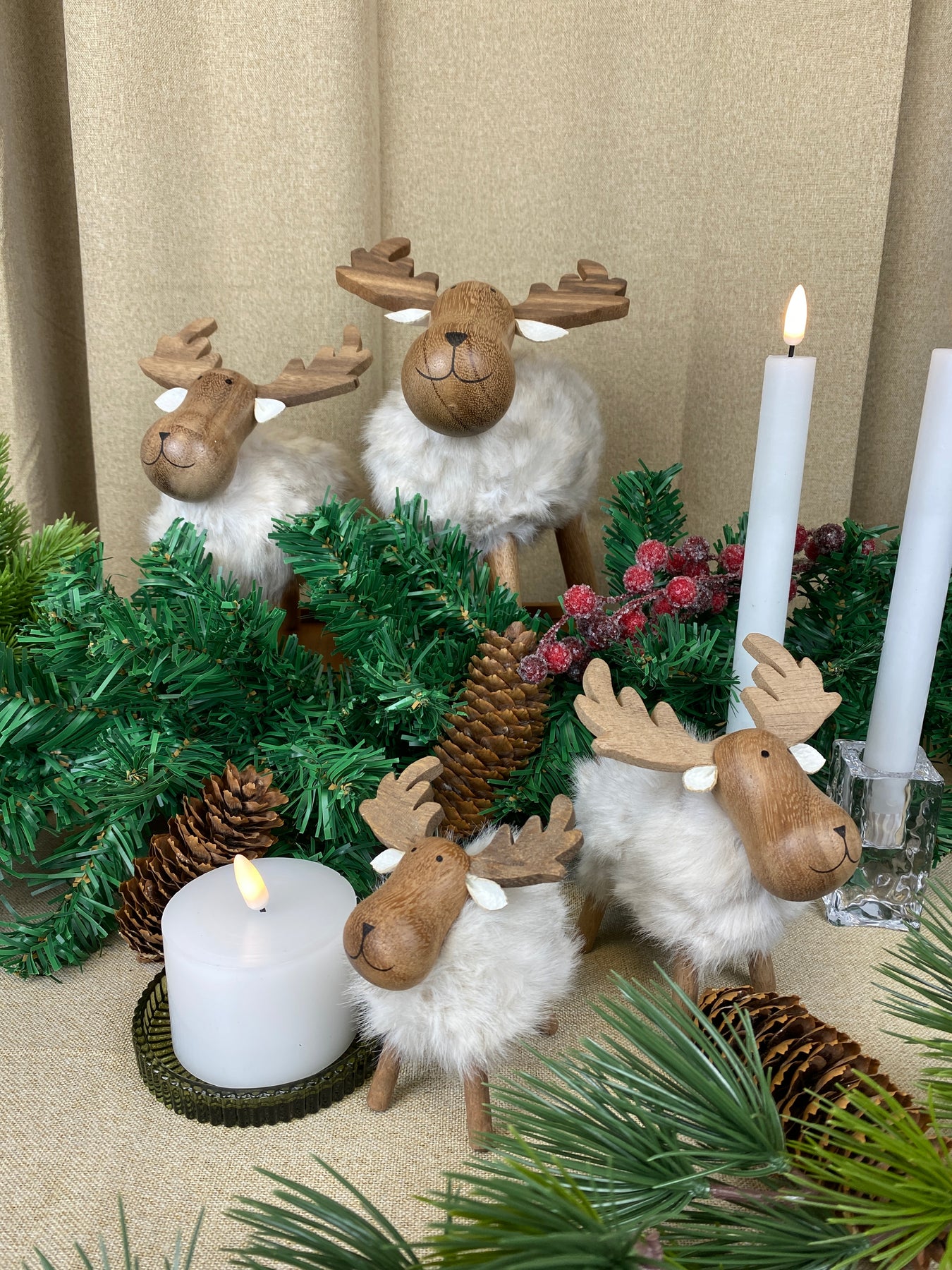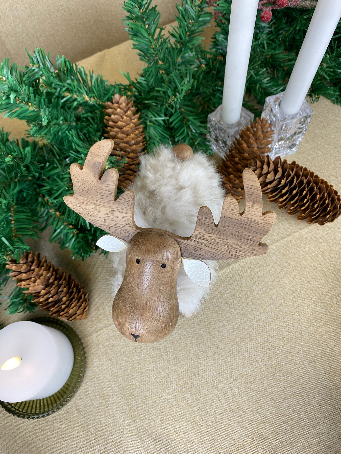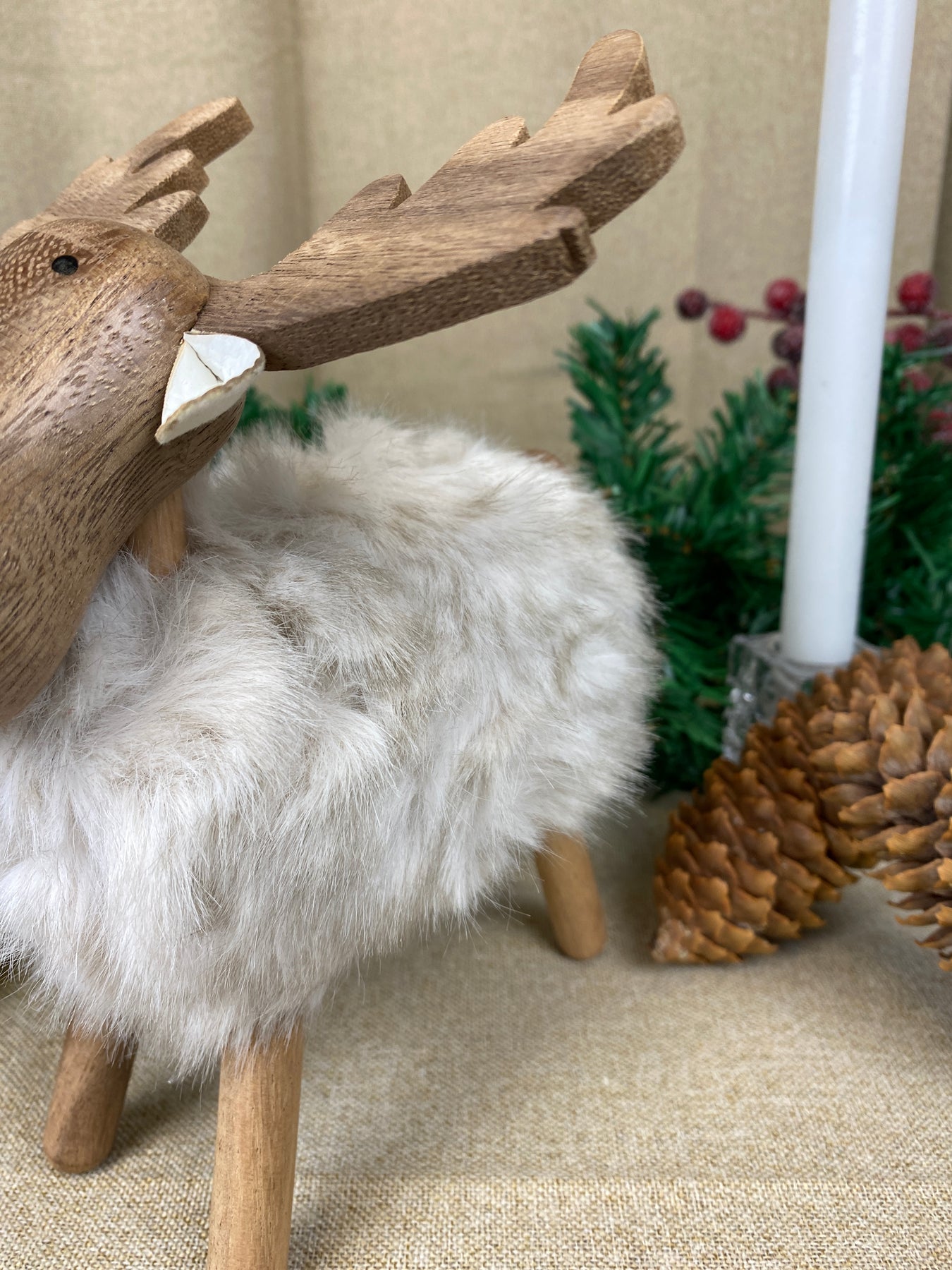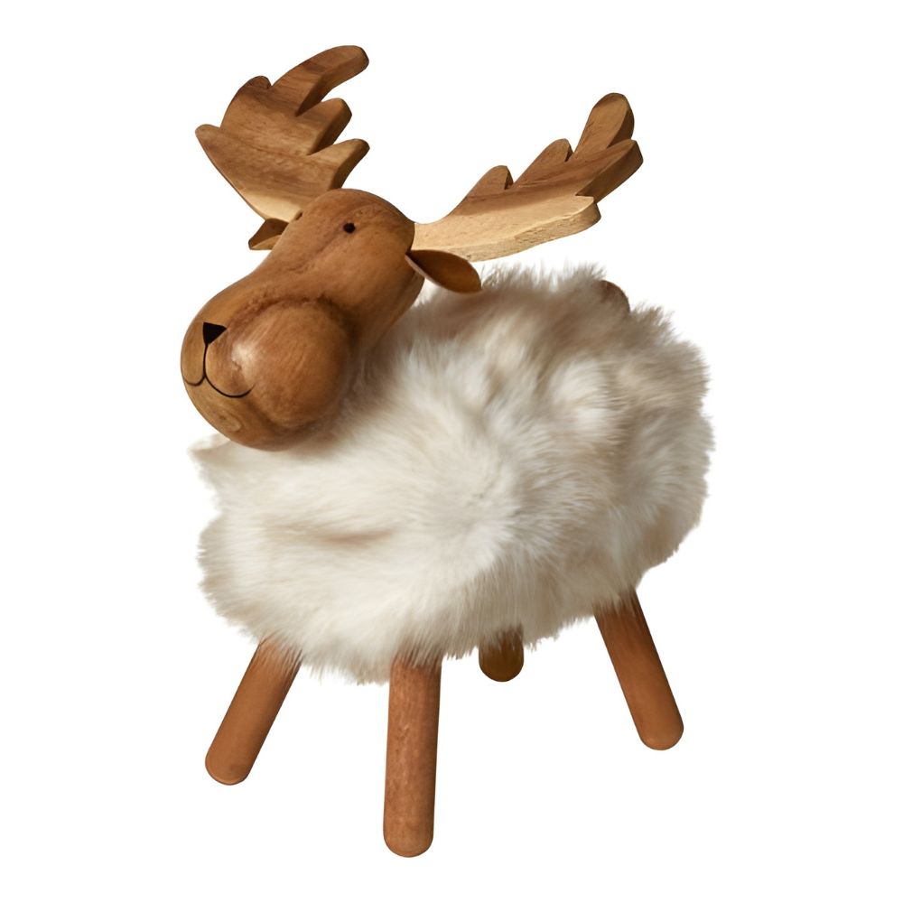 Sød elg med blød pels i hvid farve – perfekt som en hyggelig og dekorativ detalje i din indretning. Figuren kombinerer det naturlige udtryk fra træ med den bløde og lune tekstur fra polyesterpelsen, hvilket giver et varmt og charmerende udtryk.