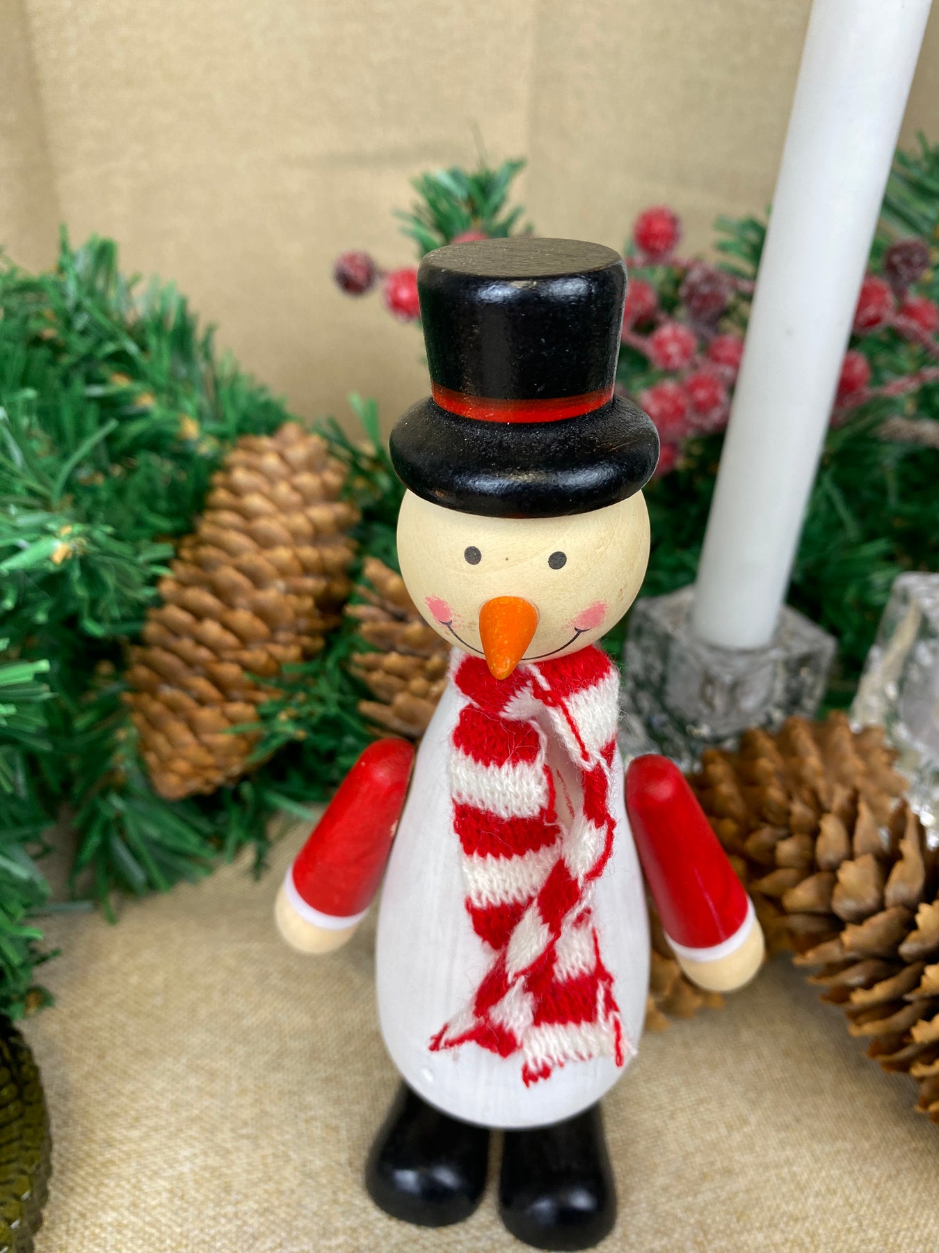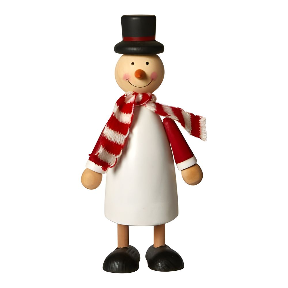 Dekorativ snemand i fyrretræ malet hvid og pyntet med et lille tørklæde, der giver figurens udtryk ekstra charme og personlighed. Den fine kombination af naturligt træ og klassiske julefarver skaber en hyggelig og nordisk julestemning.