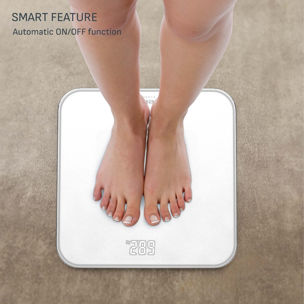 Tefal – Personvægt Classic 3 White er en stilren og brugervenlig badevægt med et slankt design, der gør den nem at opbevare, når den ikke er i brug. Den elegante hvide farve og den glatte glasoverflade passer perfekt ind i et moderne badeværelse.