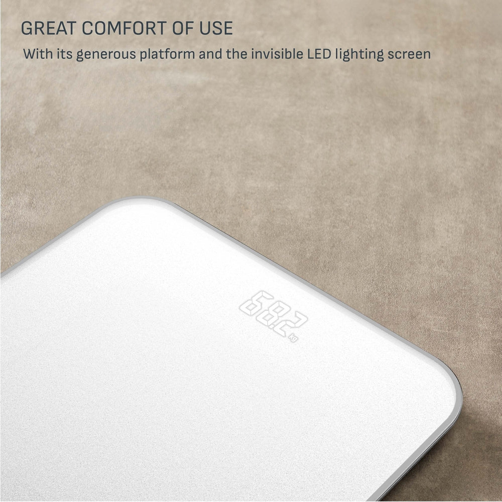Vægten er udstyret med automatisk ON/OFF-funktion, som gør den nem at bruge – du skal blot træde op på vægten, og den tænder automatisk. Den store platform giver god komfort under brug, og det usynlige LED-display lyser tydeligt op, når vægten er i brug.