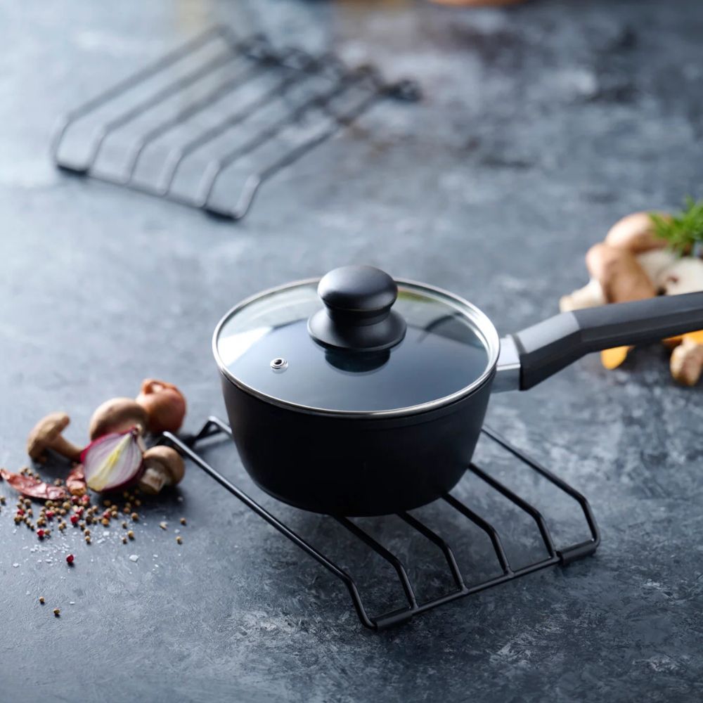 En praktisk afsætningsrist, der gør det nemt at beskytte bordet under madlavning og servering.
