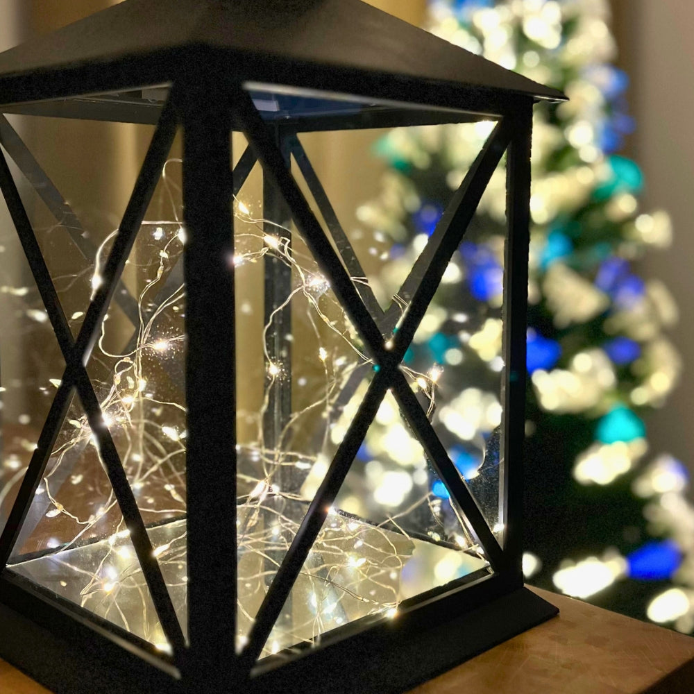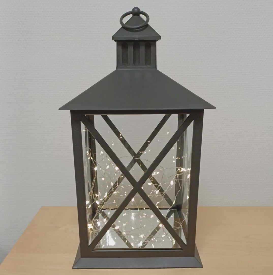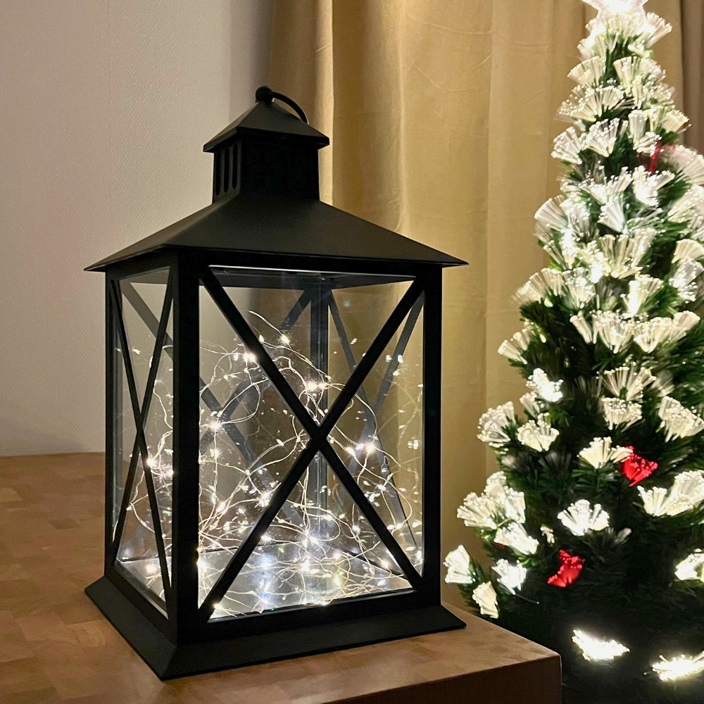 Supermysig lykta i svart plast med en ljusslinga av tråd som ger ett fint varmvitt ljus. Lyktan har en vanlig på/av-knapp i botten. Lyktan är avsedd för inomhusbruk och drivs med 9 x AAA-batterier - ingår ej.