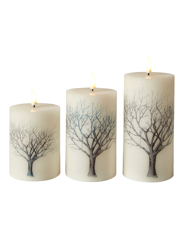 Varje ljus har en diameter på 7,5 cm och varierar i höjd: 10 cm, 12,5 cm och 15 cm. Perfekt för fönsterbrädor, myshörnor eller som dekorativ mittpunkt på matbordet. Drivs av batterier - utan sot och brandrisk, men med samma stämningsfulla effekt som riktiga ljus.