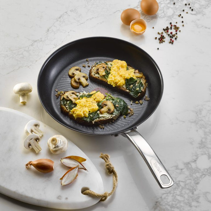 Tefal Intuition-stekpannan har en robust och hållbar konstruktion med ett ergonomiskt handtag som är värmetåligt, vilket gör det enkelt och säkert att hantera pannan under tillagningen. Handtaget är också utformat för att ge ett bra grepp och bekväm användning.
