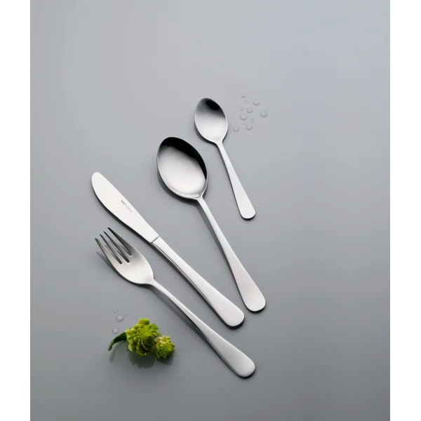 Gaffeln har en blank yta som ger den ett modernt och raffinerat utseende. Den har en behaglig vikt och balanserad design som gör den lätt att hantera under måltiderna. Med sin smala och strömlinjeformade form ligger den bekvämt i handen och ger en behaglig matupplevelse.
