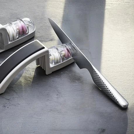 Denna innovativa knivslip från Global har diamantslipmedel och ultraprecis vinkelkontroll för optimala resultat varje gång. Den användarvänliga designen och det låga underhållet gör den lämplig för både proffs och hemmakockar. Den patenterade tekniken ger en rakbladsvass egg upp till 10 gånger snabbare än konventionella metoder.