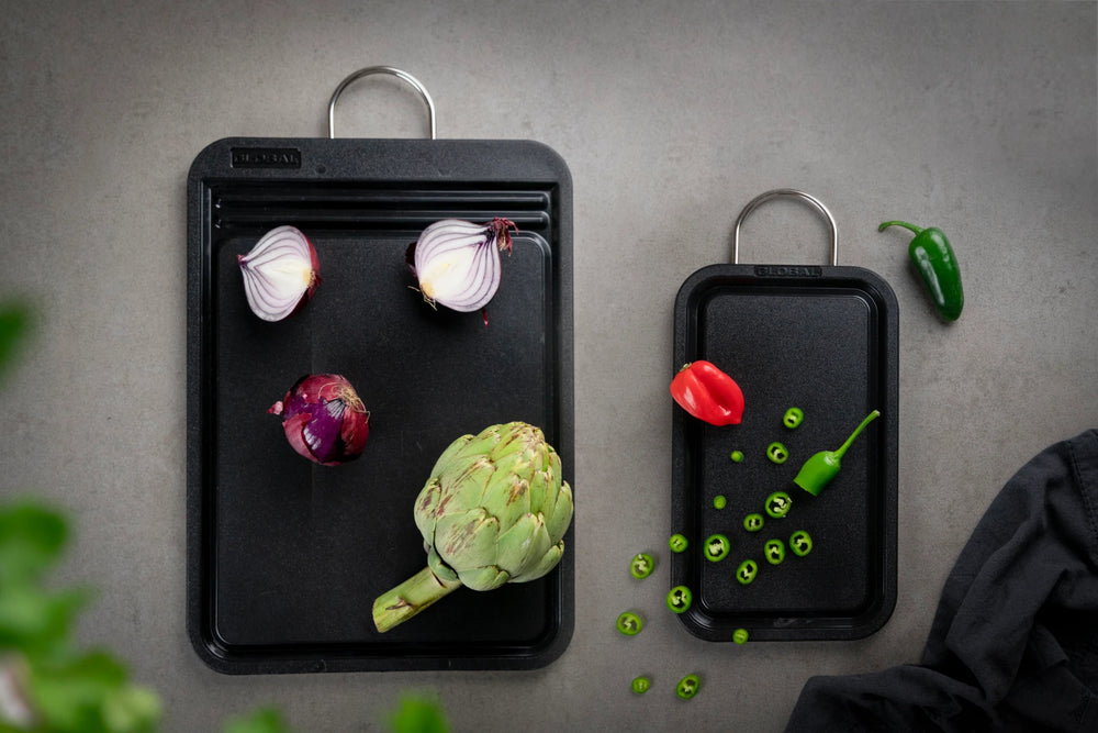 Global Cutting Board 2-pack består av två slitstarka skärbrädor i plast, G-1004 och G-1005, perfekta för både daglig matlagning och professionellt bruk. Brädorna är tillverkade av slitstark plast som är lätt att rengöra och reptålig. Den praktiska storleken gör dem lämpliga för att skära grönsaker, kött och andra ingredienser, samtidigt som de skyddar dina köksytor.