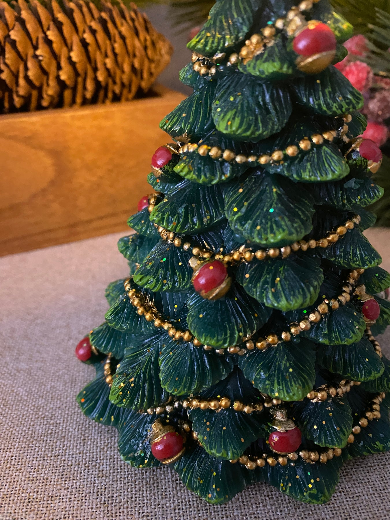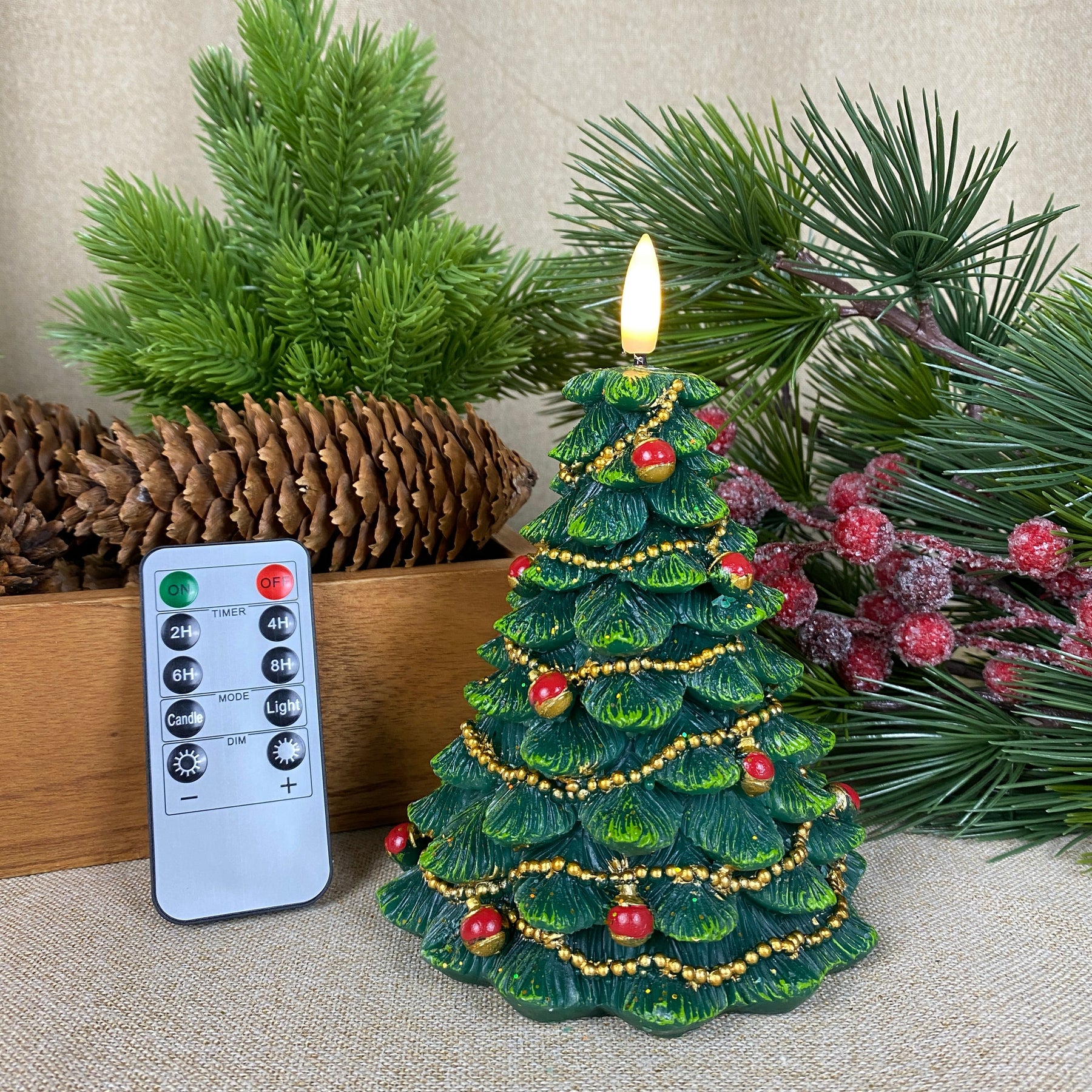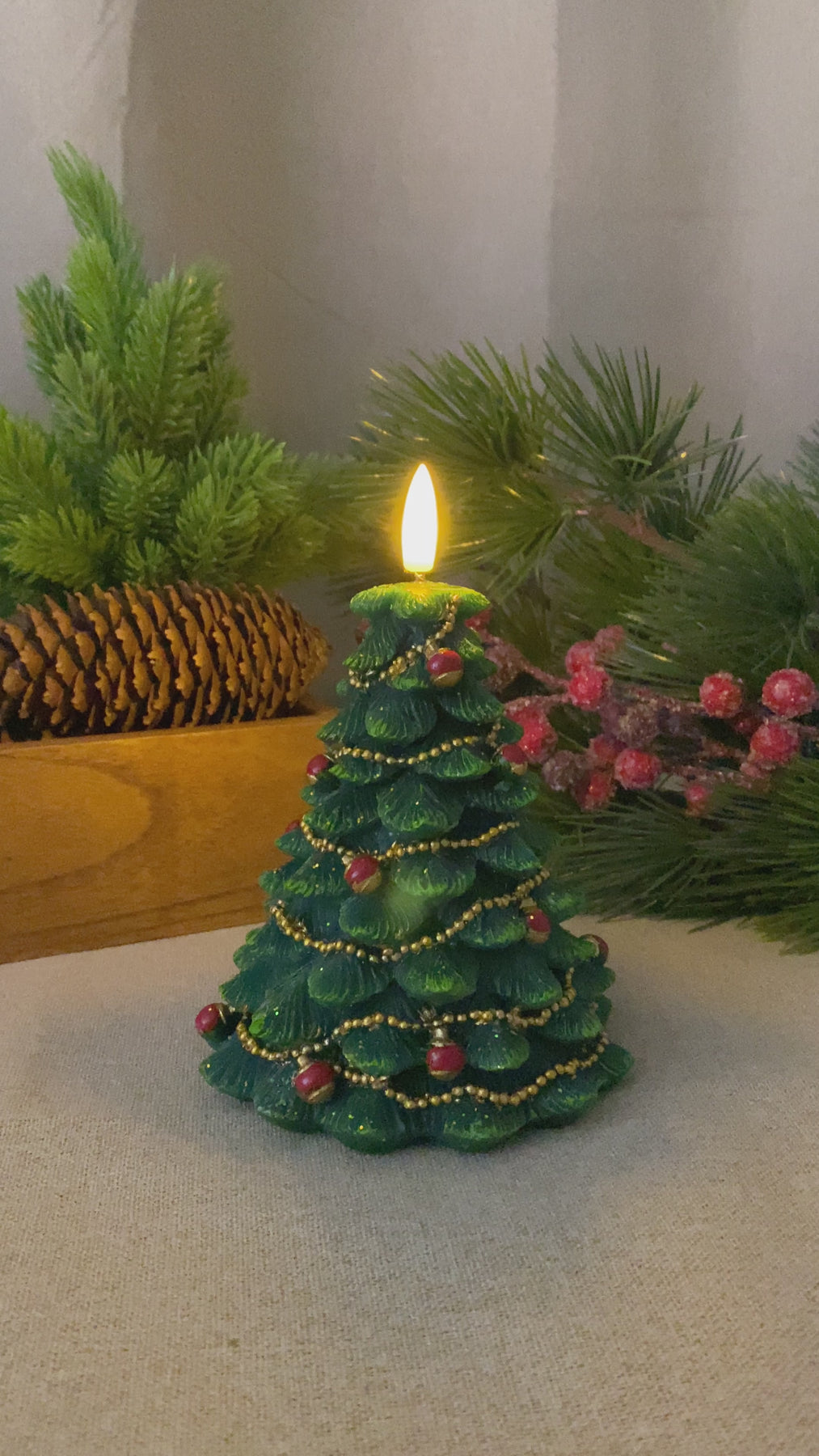Skapa en mysig och stämningsfull jul med detta LED-vaxljus format som en julgran i en elegant grön färg. Ljuset är tillverkat av riktigt vax , vilket ger ett naturligt utseende och ett varmt, livfullt sken – helt utan brandrisk.