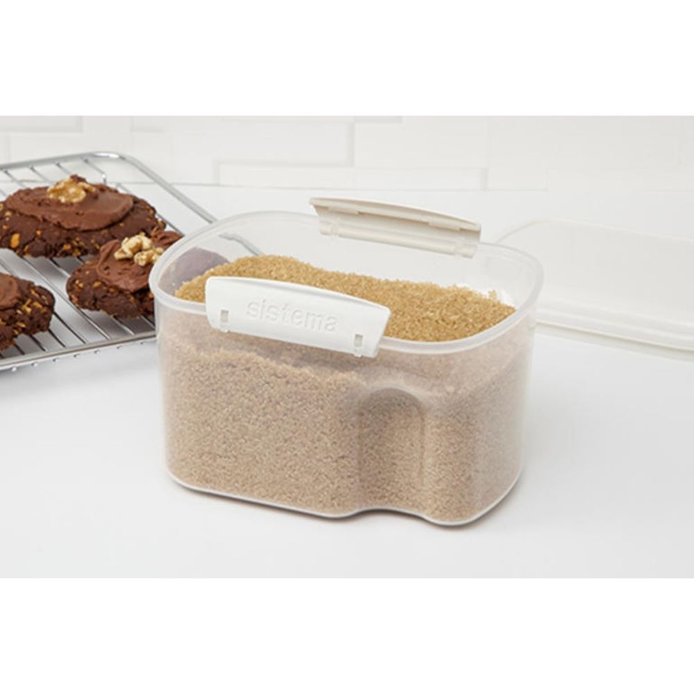 Behållaren, som ingår i Bake It™-serien, har Sistemas patenterade låsklämma och en flexibel försegling som hjälper till att hålla innehållet färskt längre. Den medföljande koppen gör det enkelt att dosera ingredienser direkt från förpackningen.
