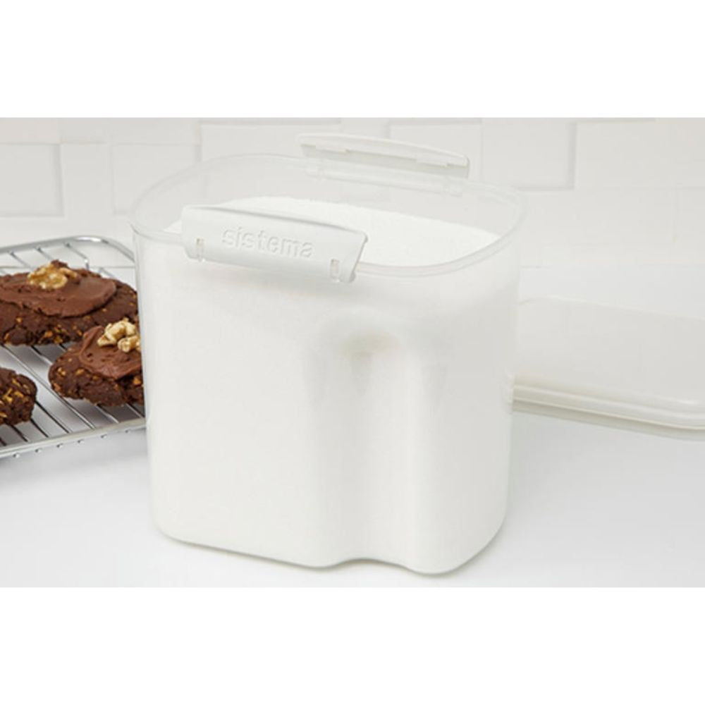 Behållaren är en del av Bake It™-serien och levereras med en praktisk mätkopp så att du enkelt kan dosera direkt från förpackningen. De patenterade låsklämmorna och den flexibla förseglingen säkerställer att innehållet håller sig färskt längre.