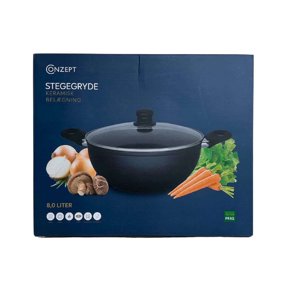 Conzept stekpanna med 8 liters kapacitet och medföljande glaslock är ett mångsidigt och pålitligt verktyg för tillagning av stora portioner av olika rätter. Conzept-stekpannan är utformad med funktionalitet, hållbarhet och modern design i åtanke.