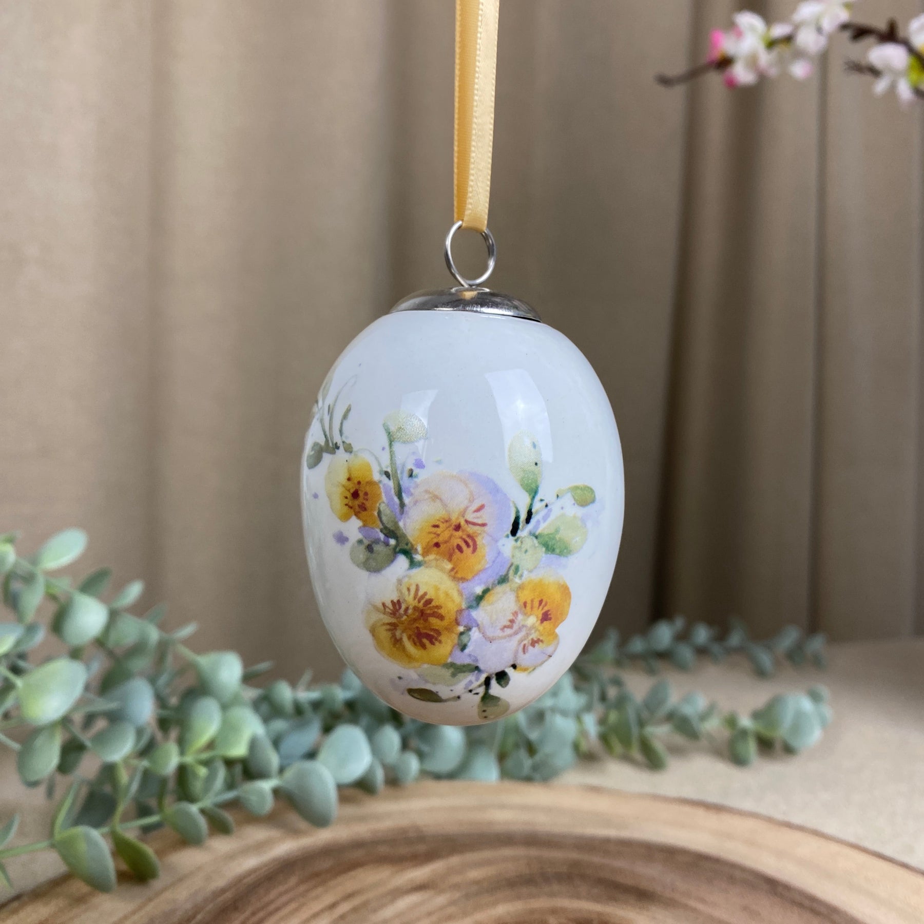 Smukt og stemningsfuldt dekorationsæg til ophæng, perfekt til forårs- og påskepynt. Ægget er dekoreret med fine stedmoderblomster, som giver et let og elegant udtryk.