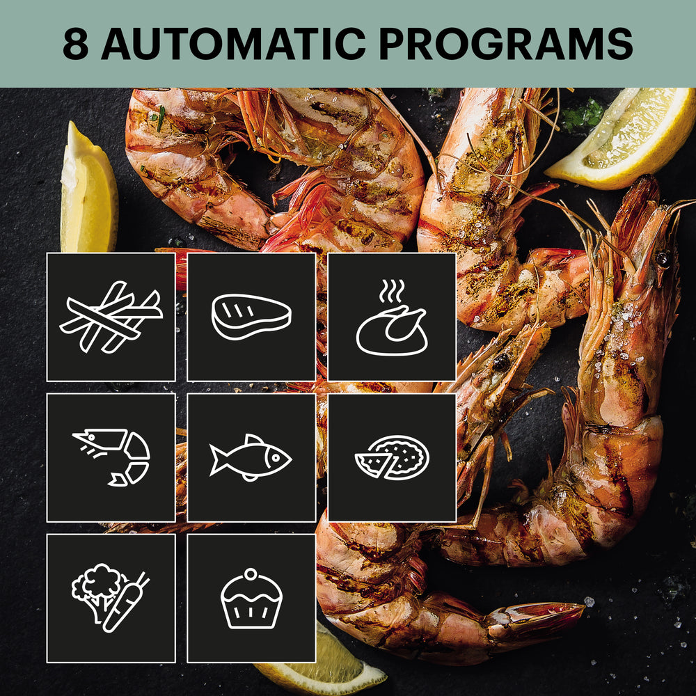 Med en ekstra stor kapacitet på 7,5 liter kan Easy Fry Mega lave mad til op til 8 personer, hvilket gør den ideel til både hverdagsmad og gæstemiddage. Det digitale display og de 8 automatiske programmer gør madlavningen nem og overskuelig – uanset om du tilbereder pommes frites, kød, fisk, grøntsager eller bager.