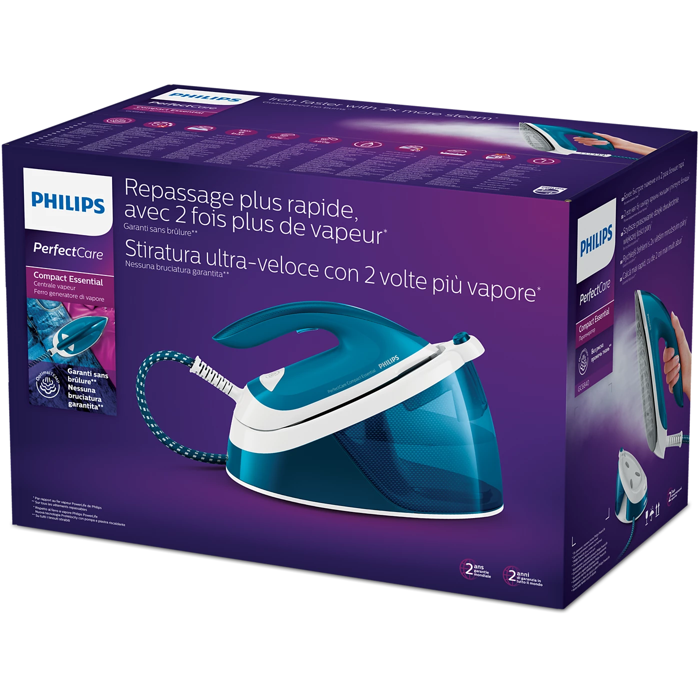 Spar tid, beskyt dit tøj og opnå professionelle resultater hver gang med Philips PerfectCare Compact Essential 2400 W – dampstationen, der gør strygningen hurtigere, sikrere og mere problemfri.