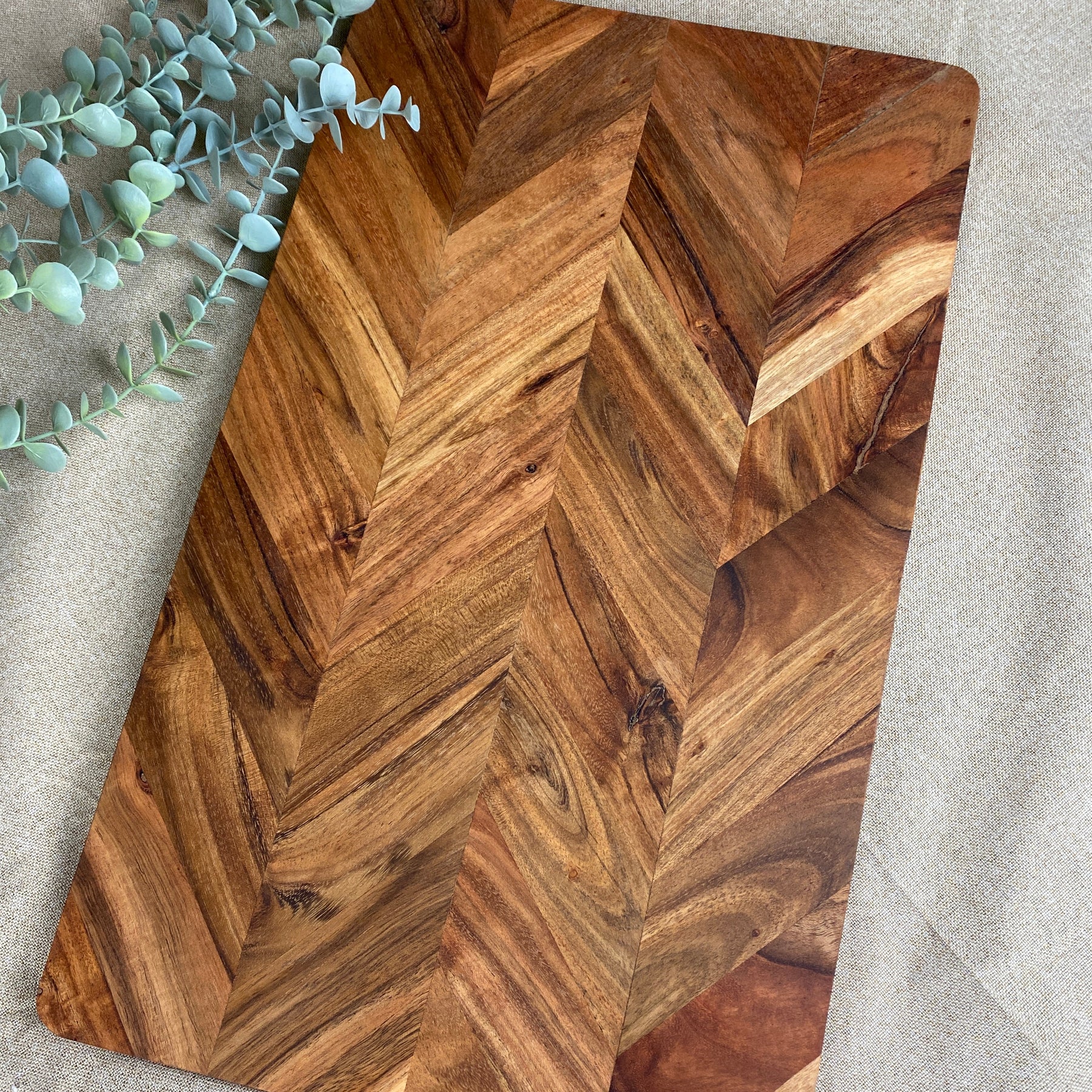 Exklusiv och funktionell skärbräda i oljat akaciaträ med ett vackert fiskbensmönster , som kombinerar praktisk användning med elegant design. Med sina generösa mått på 50 × 30 cm erbjuder skärbrädan en bra arbetsyta för att skära kött, grönsaker och bröd.